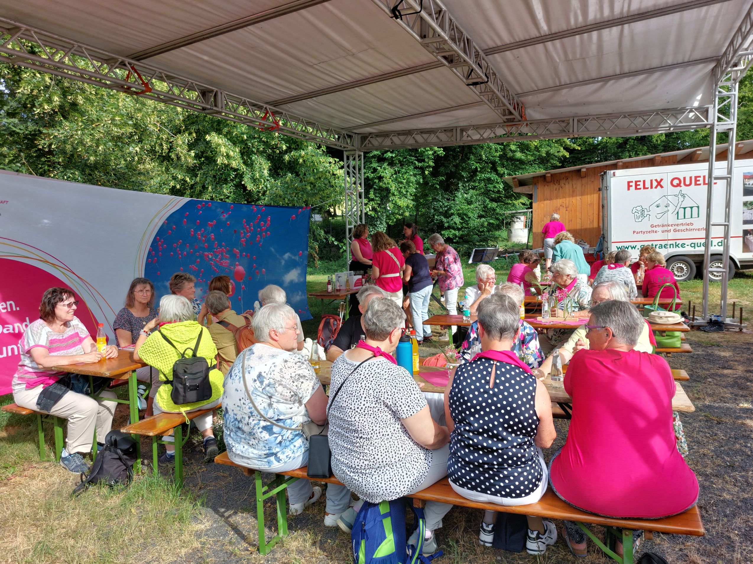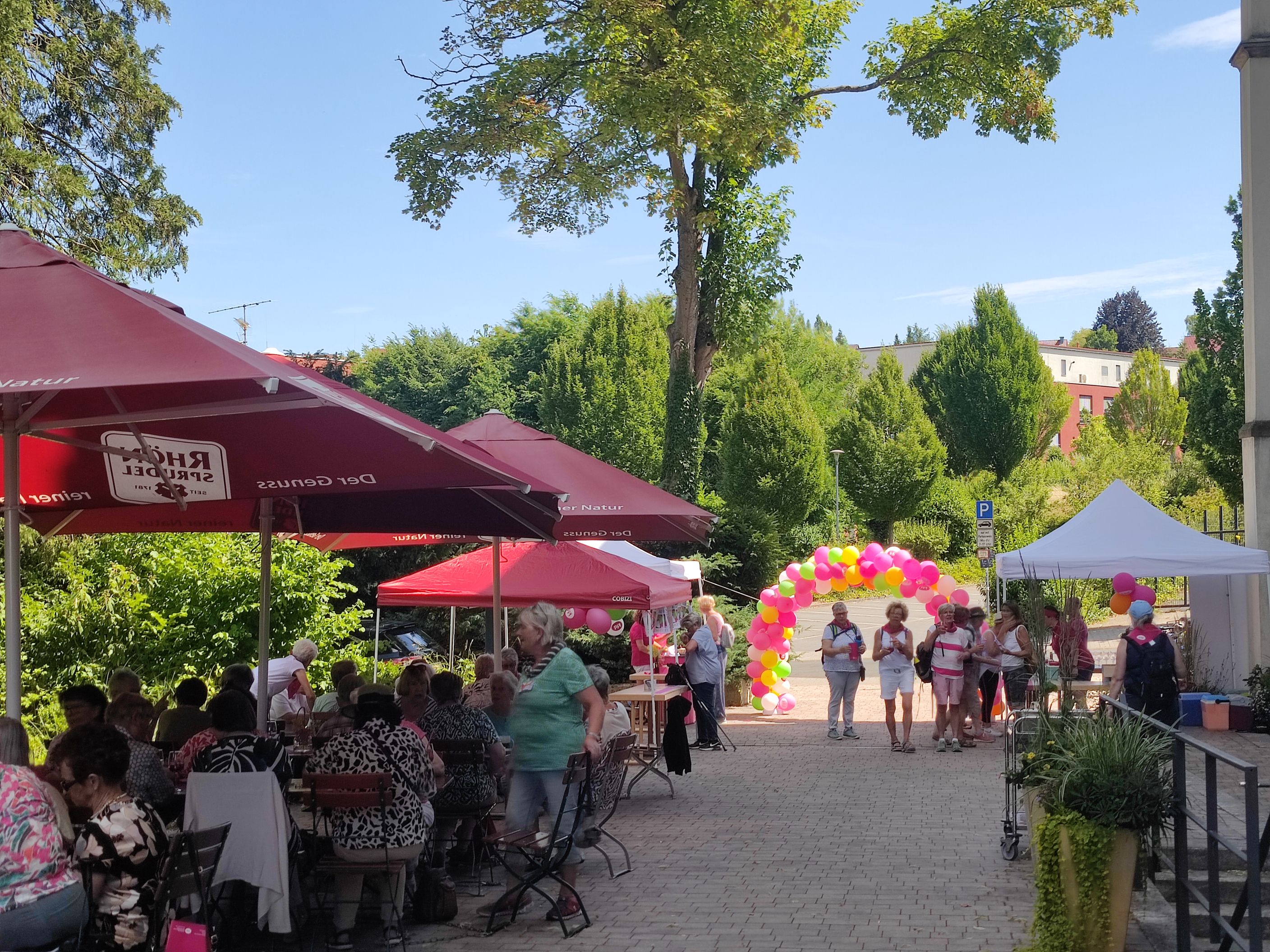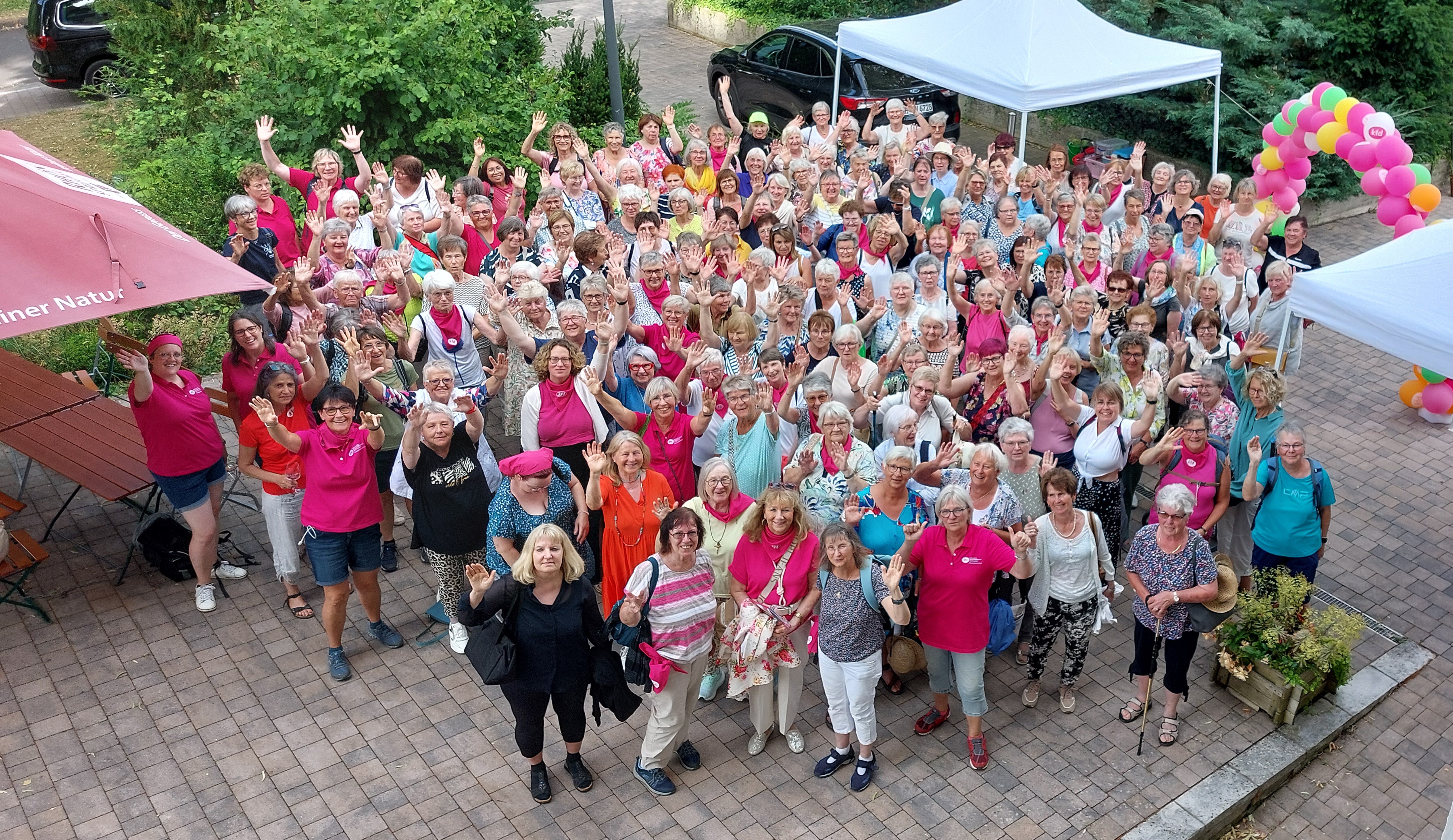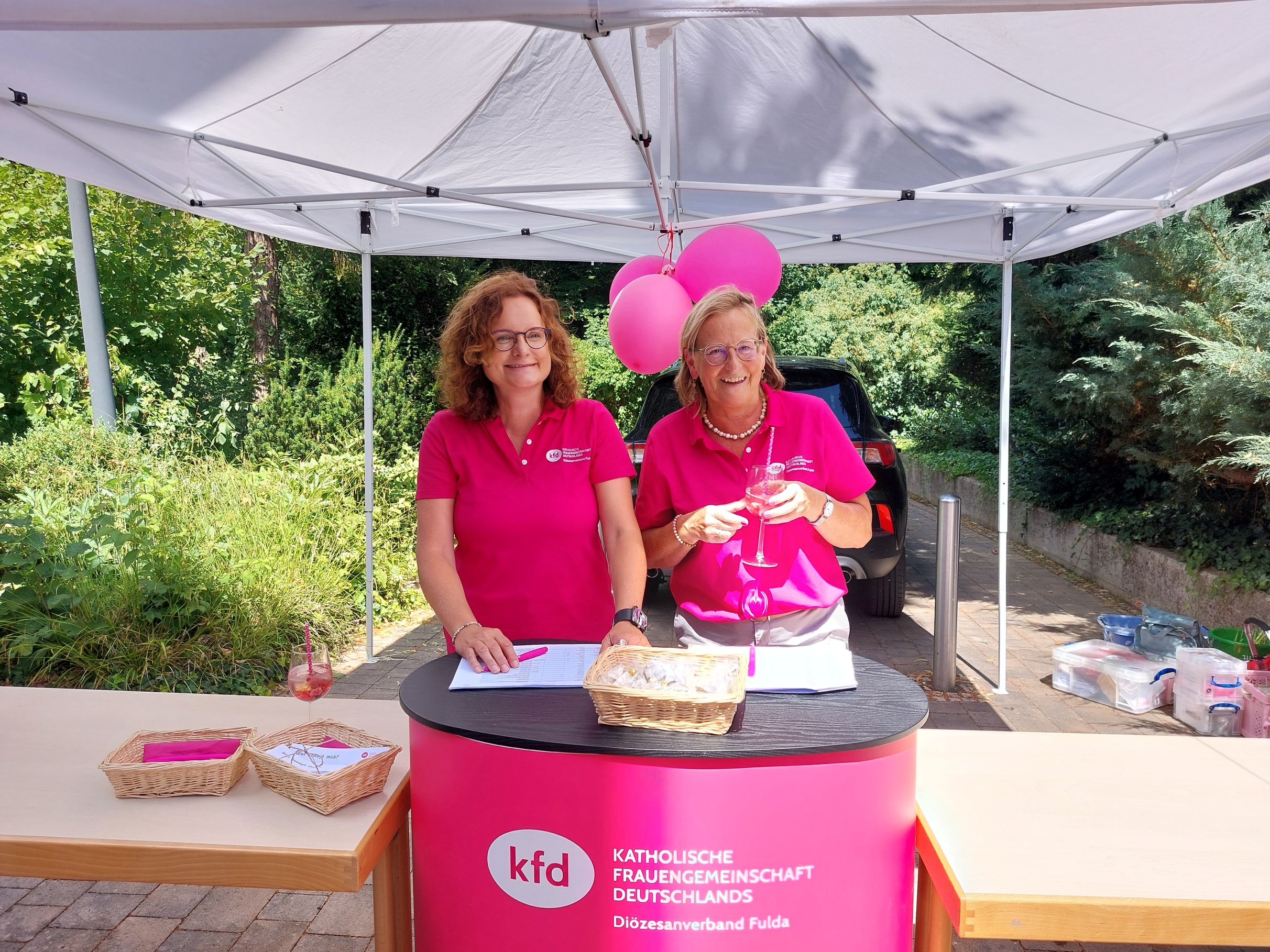 In Hünfeld angekommen wurden sie begrüßt von den strahlenden Frauen der kfd-Geschäftsstelle: Mit bunten Luftballons, der Anstecknadel "die Pilgerin", einem leckeren Cocktail und Kaffee und Kuchen. In geselligem Miteinander wurde die Zeit bis zum Gottesdienst bei bestem Wetter verbracht.