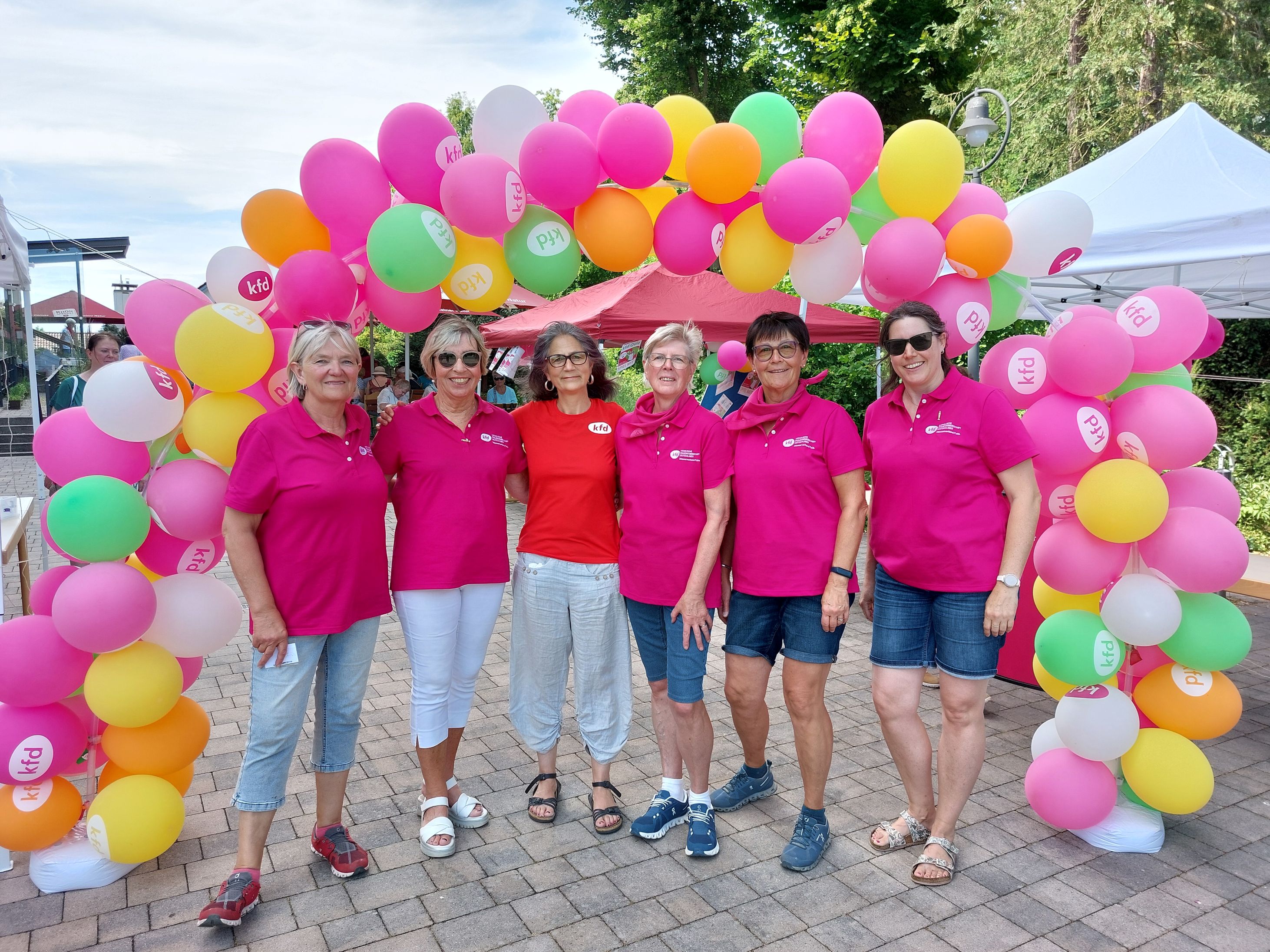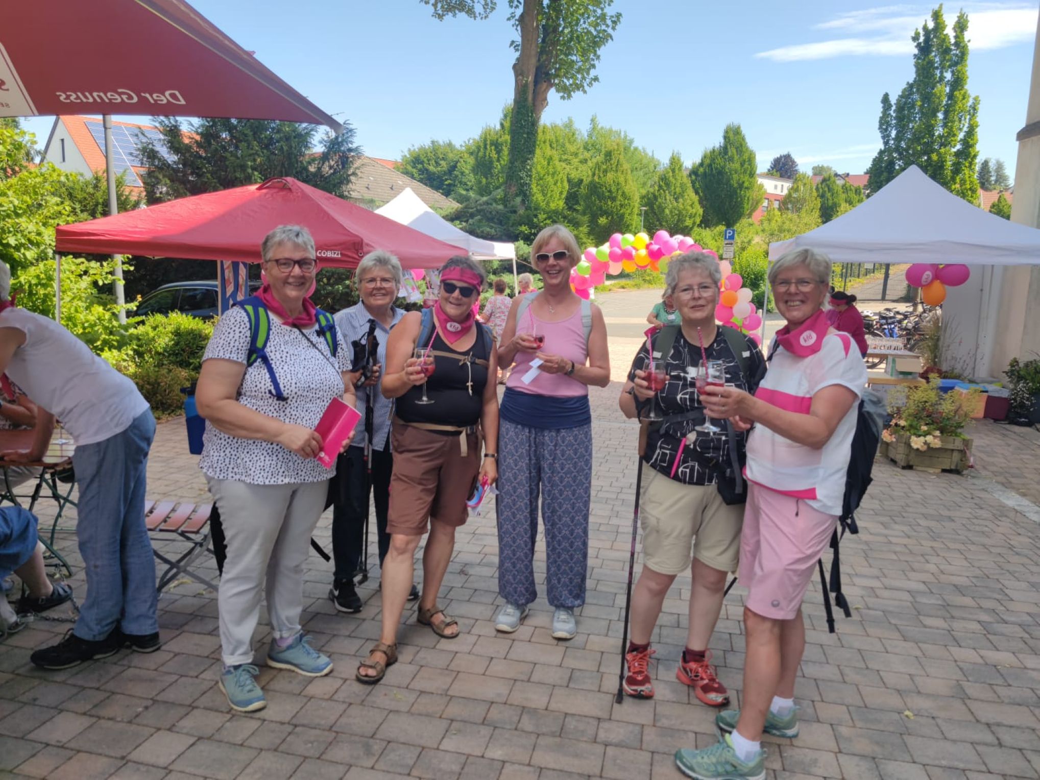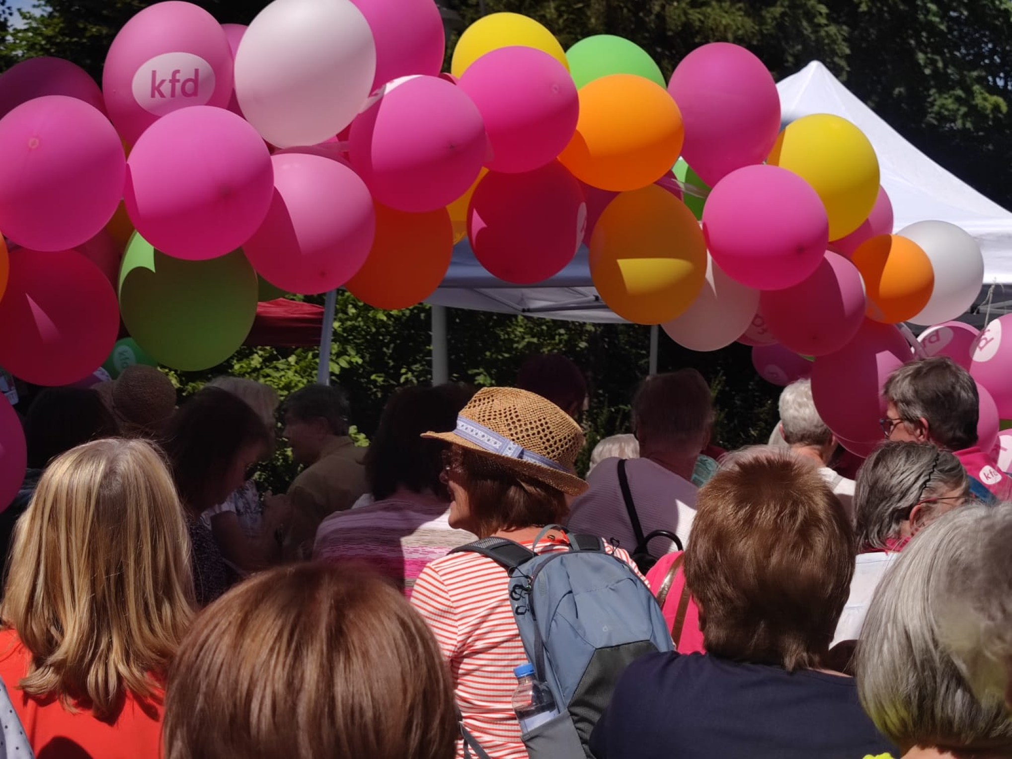 In Hünfeld angekommen wurden sie begrüßt von den strahlenden Frauen der kfd-Geschäftsstelle: Mit bunten Luftballons, der Anstecknadel "die Pilgerin", einem leckeren Cocktail und Kaffee und Kuchen. In geselligem Miteinander wurde die Zeit bis zum Gottesdienst bei bestem Wetter verbracht.