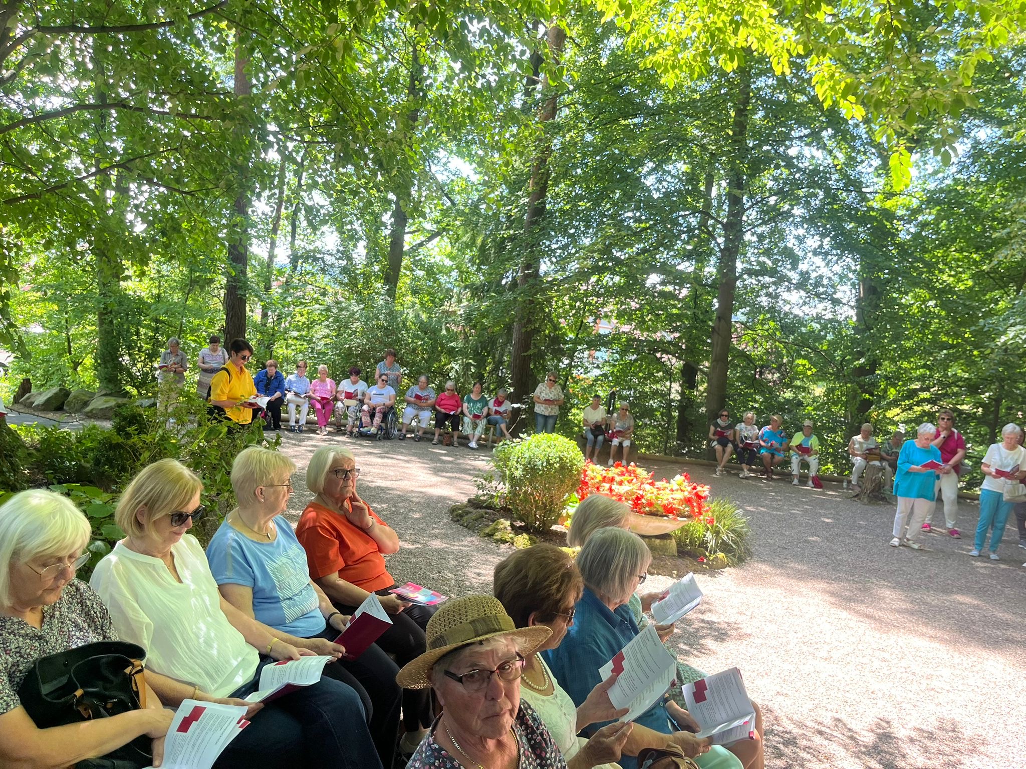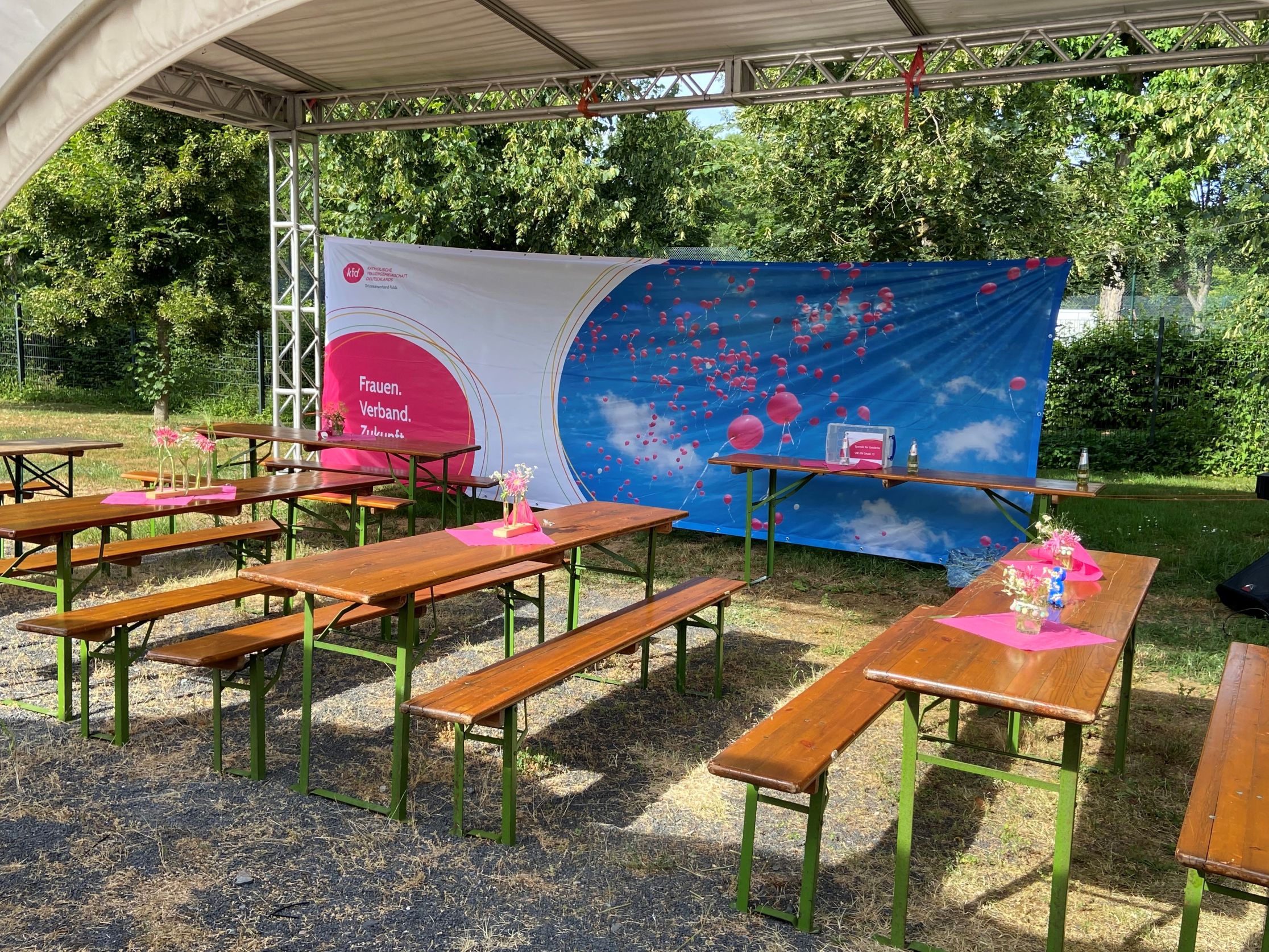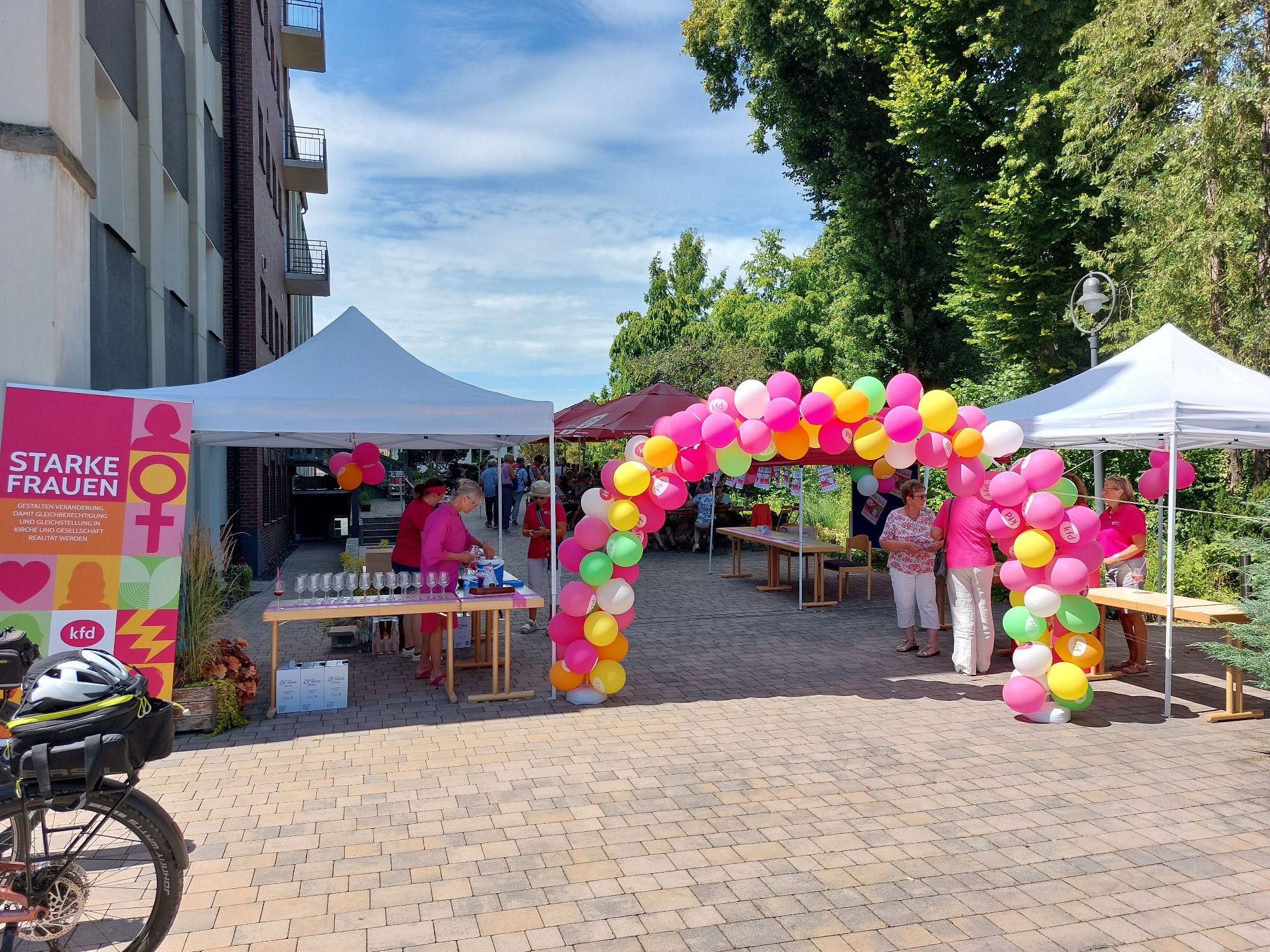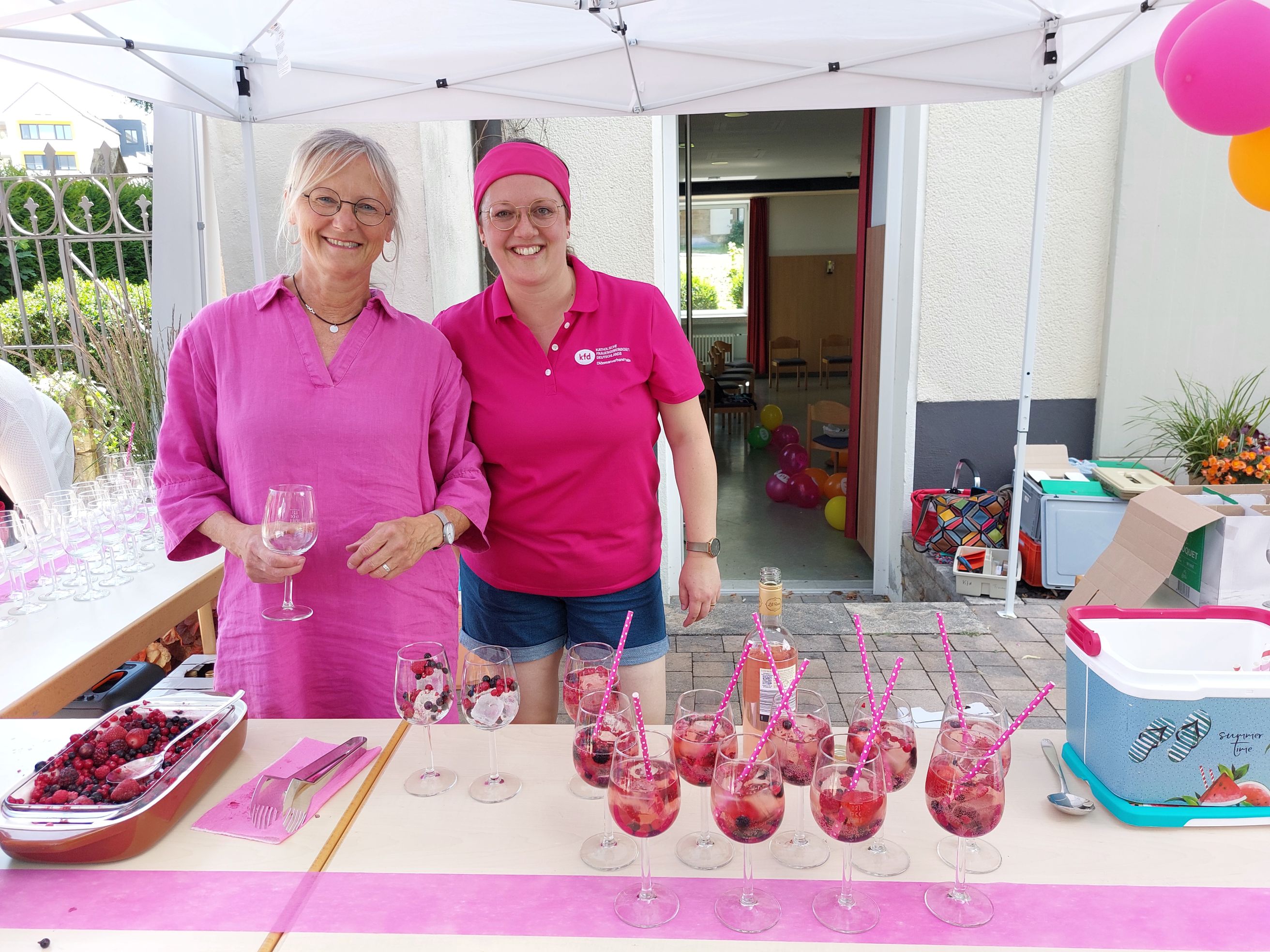 In Hünfeld angekommen wurden sie begrüßt von den strahlenden Frauen der kfd-Geschäftsstelle: Mit bunten Luftballons, der Anstecknadel "die Pilgerin", einem leckeren Cocktail und Kaffee und Kuchen. In geselligem Miteinander wurde die Zeit bis zum Gottesdienst bei bestem Wetter verbracht.