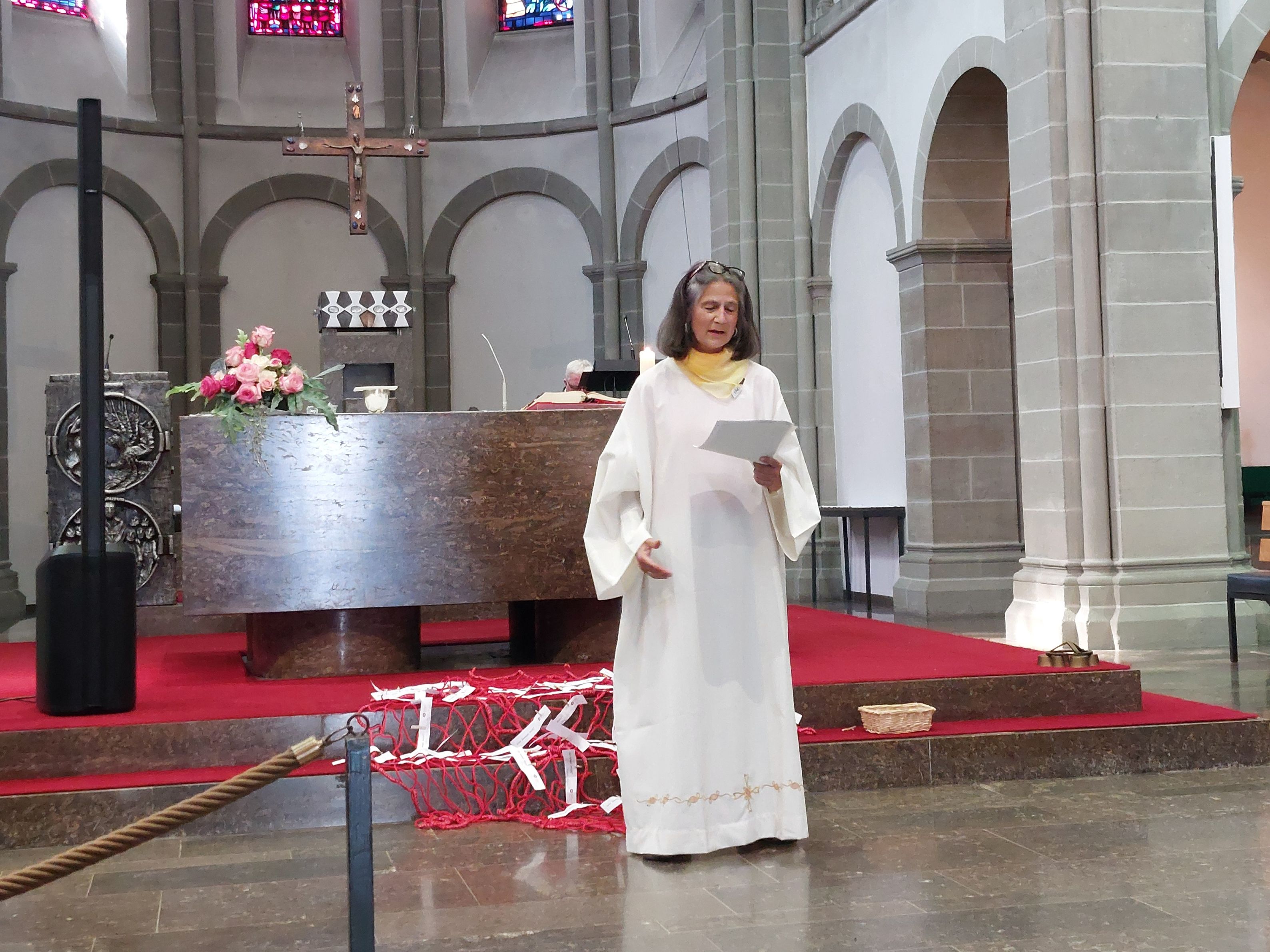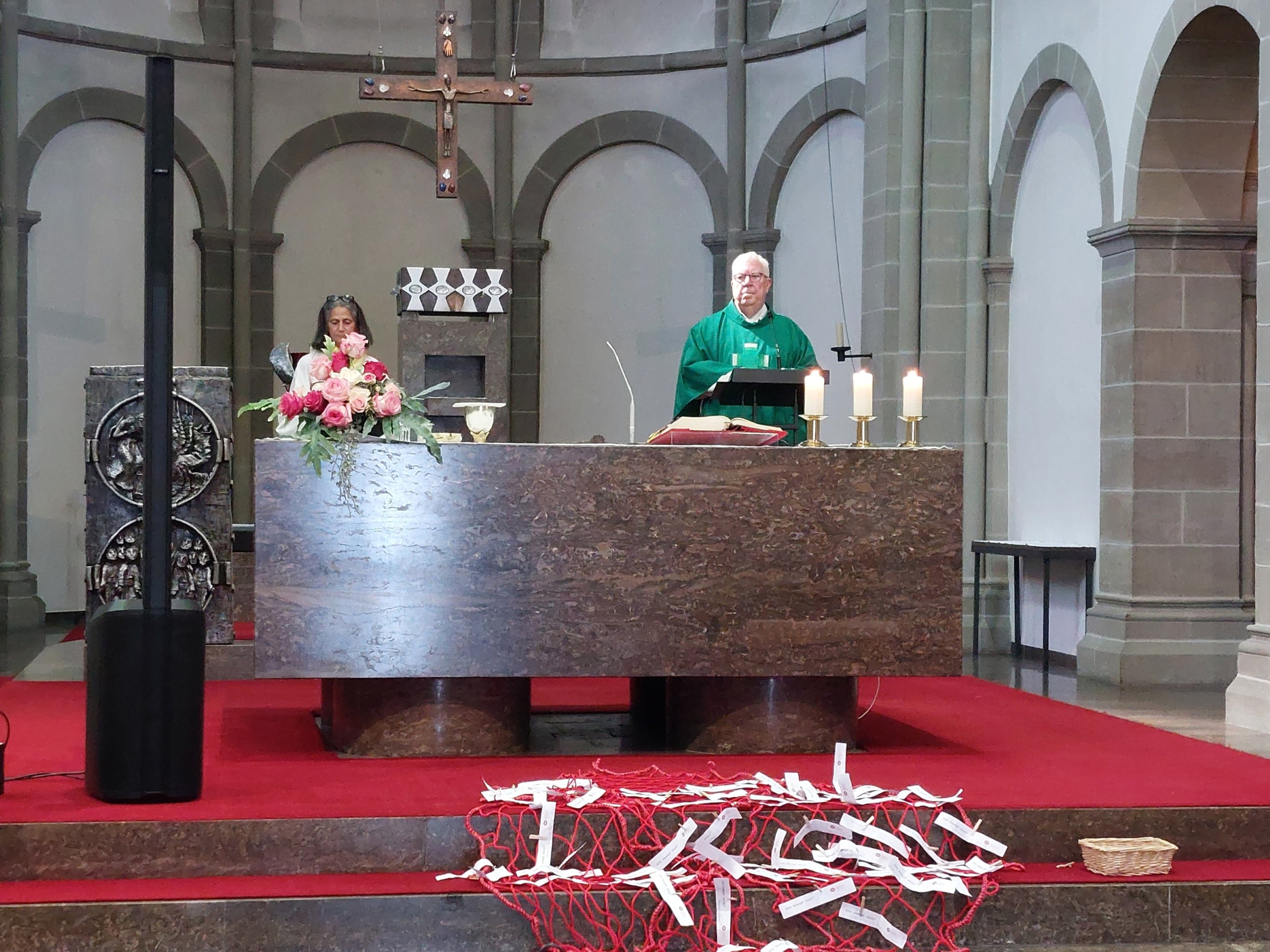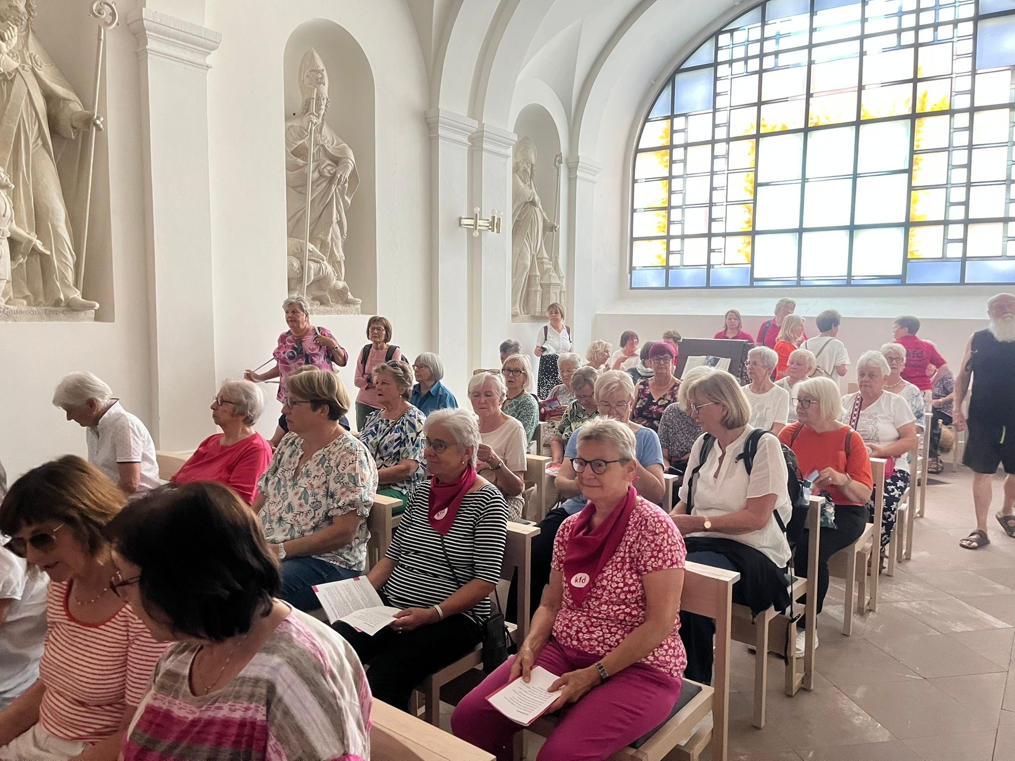 In der vollbesetzten Klosterkirche feierten die Frauen mit der geistlichen Leiterin der kfd Fulda Frau Patricia Kraus, Pater Stegemann und der Songgruppe Lehnerz einen beschwingten Gottesdienst. Die christlichen Texte zu den Melodien von Klassikern wie "Griechischer Wein", "Über sieben Brücken musst du geh´n" oder "Bella Ciao" brachte so manche Frau zum Nachdenken, zum Schmunzeln aber vor allen Dingen zum kräftigen Mitsingen. Die kfd-Diözesanreferentin Frau Stefanie Wahl wurde in diesem feierlichen Rahmen in den Mutterschutz und die Elternzeit verabschiedet und Frau Juliane Peffermann als Vertretung begrüßt.